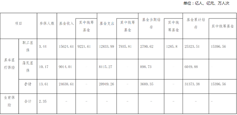 全年基本醫(yī)療保險基金(含生育保險)總收入、總支出分別為24638.61億元、20949.26億元,年末基本醫(yī)療保險(含生育保險)累計結(jié)存31373.38億元[2]。