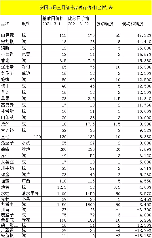 事實(shí)上,除了亳州藥材市場(chǎng),安國(guó)藥市也有多種品種行情上揚(yáng)。例如草果、郁金、黑胡椒、白豆蔻等。