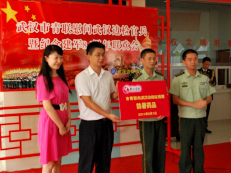 2011年8月1日,團市委書記、武漢市青年聯(lián)合會主席沈濤及武漢市青年聯(lián)合會副秘書長、東信醫(yī)藥集團董事長田南希代表武漢市青年聯(lián)合會向武漢邊檢官兵捐贈防暑飲品。在紀念人民解放軍建軍84周年之際,表達了武漢市青年聯(lián)合會對邊檢官兵的崇敬之情,及東信醫(yī)藥集團對邊檢官兵工作的關心與支持。