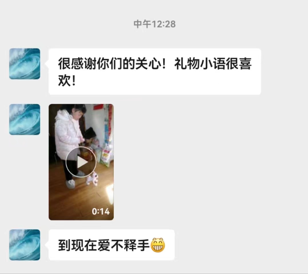 拜訪結束回去的路上,我們還收到爸爸錄的小視頻,看到視頻中對禮物愛不釋手,我們感到很欣慰。我們和的爸爸媽媽一樣,相信只要我們不斷用愛去陪伴,她會汲取到更多的能量,她的未來會越來越值得我們期待。心守暖陽,靜待花開。