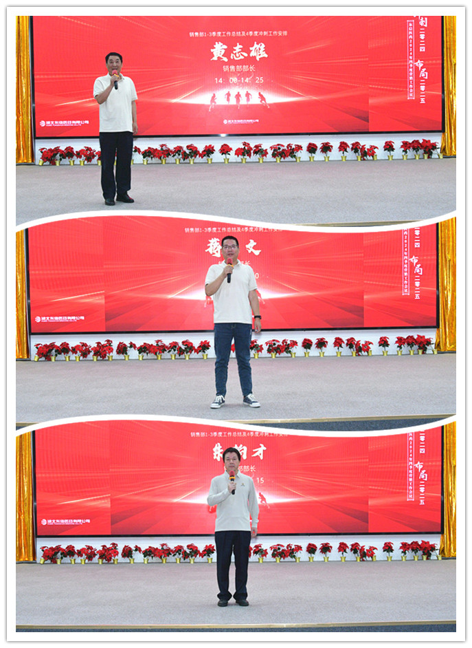 銷售部部長黃志雄、蔣文、朱柏才在匯報中亮出了南區(qū)、北區(qū)、科技產(chǎn)品一至三季度的成績單,并圍繞“沖刺2024,布局2025”的會議主題,匯報了四季度的重點工作計劃。銷售總監(jiān)張湘文全面總結了銷售部前三季度的業(yè)績達成情況,并對五大工程的推進、秋季PK活動、銷售計劃的制定等重點工作提出了具體的要求。