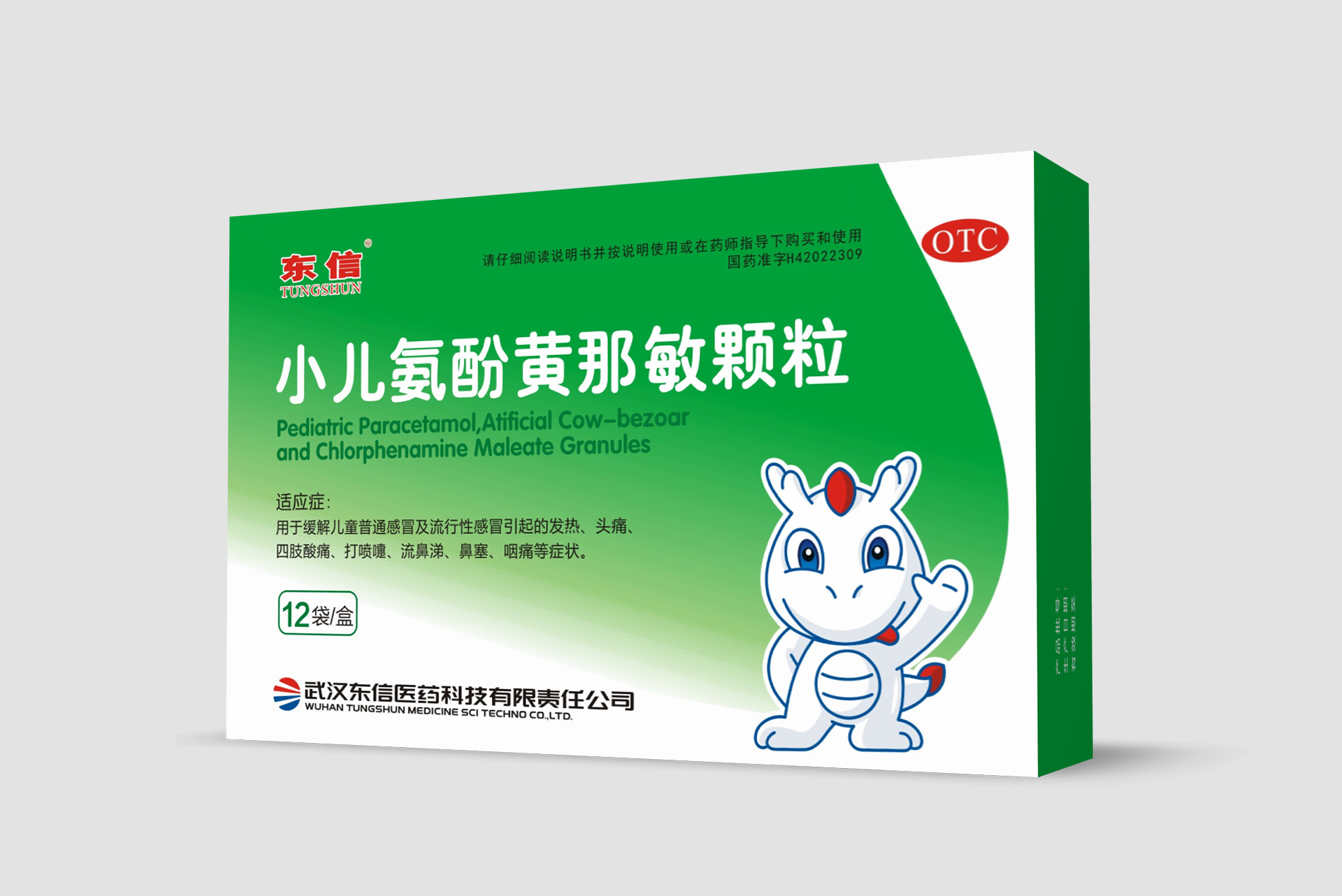 【規(guī)格】每袋含對(duì)乙酰氨基酚125毫克,馬來酸氯苯那敏0.5毫克,人工牛黃5毫克。