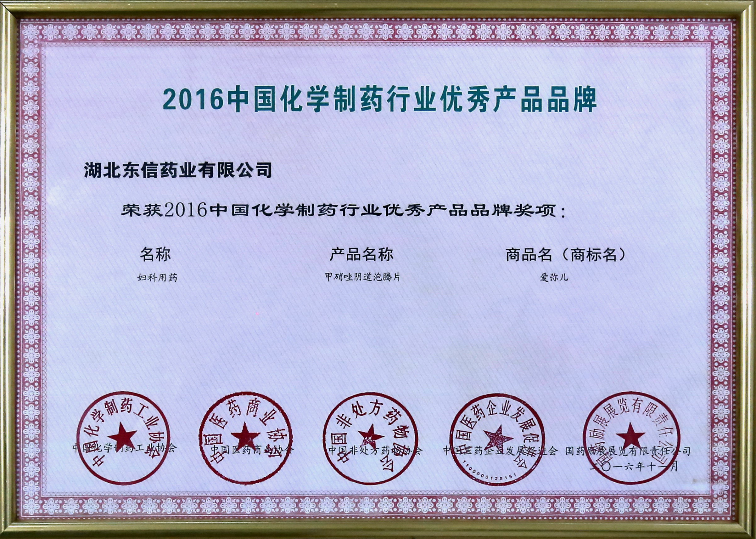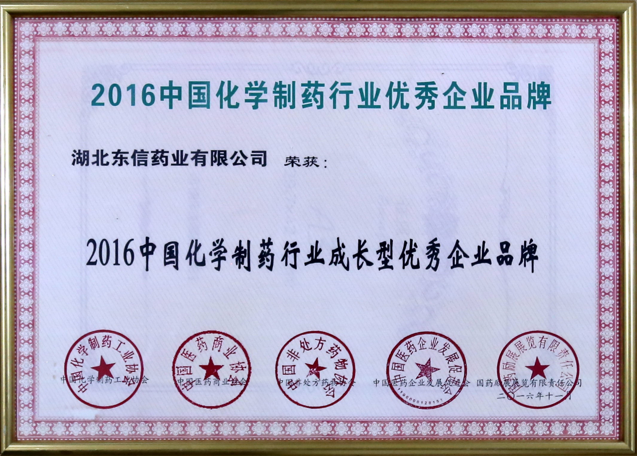 2016年11月15日,湖北東信藥業(yè)有限公司在由中國化學制藥工業(yè)協(xié)會、中國醫(yī)藥商業(yè)協(xié)會、中國非處方藥物協(xié)會、中國醫(yī)藥企業(yè)發(fā)展促進會、國藥勵展展覽有限責任公司等單位在武漢共同成功舉辦的以“質(zhì)量、誠信、品牌”為主題的“2016’中國化學制藥行業(yè)年度峰會”上榮獲嘉獎。